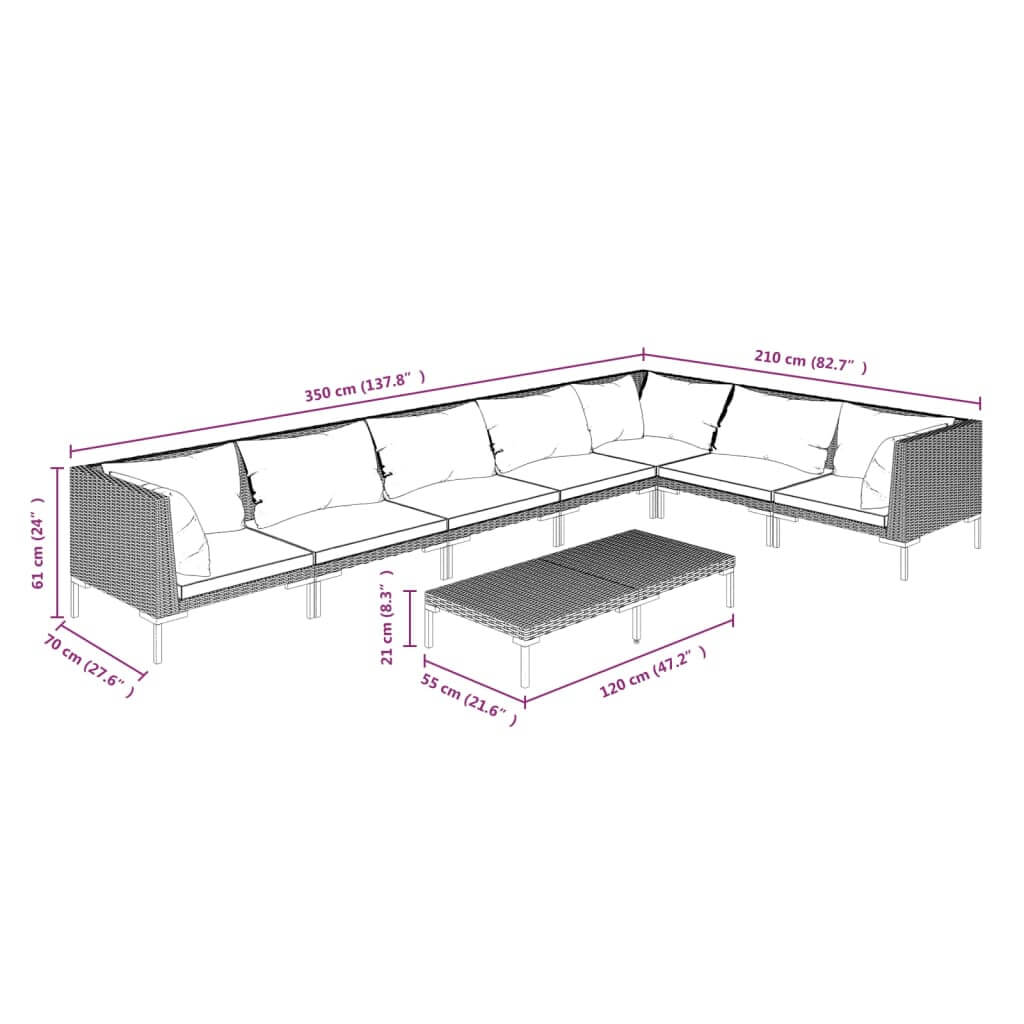 8 Piece Garden Lounge Set with Cushions Poly Rattan Dark corner sofa dimensions with pillows and measurements.