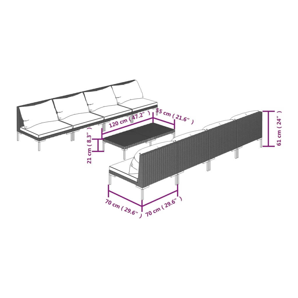 9 Piece Garden Lounge Set with Cushions Poly Rattan Dark dimensions diagram with labels.