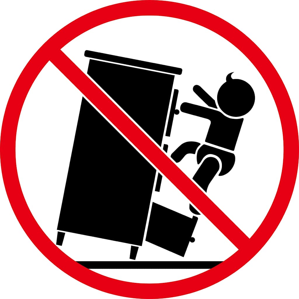 Warning sign against climbing furniture, depicting a child pulling on a dresser, safety hazard alert.