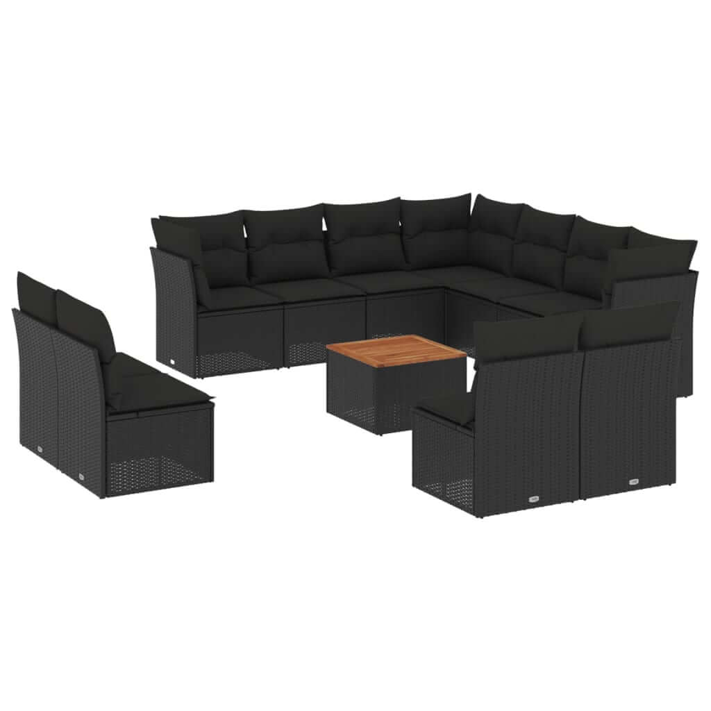 12 Piece Garden Sofa Set with Cushions Poly Rattan in black with wood tabletop for outdoor relaxation.