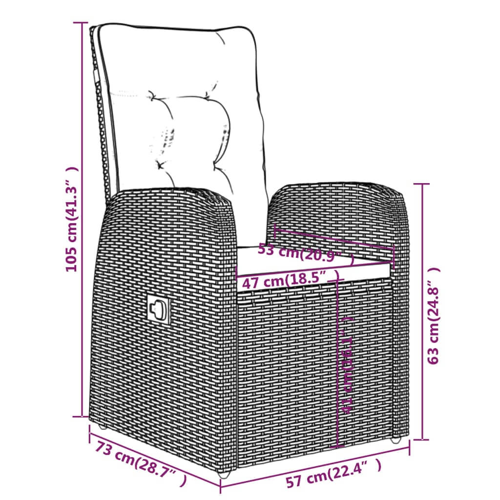 Dimensions of a 7 Piece Garden Dining Set with Cushions chair showcasing adjustable features and detailed measurements.