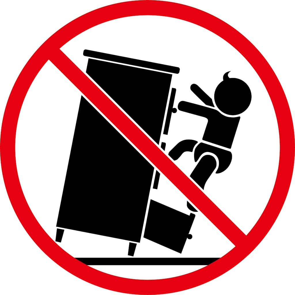 Warning sign against child climbing on furniture to prevent accidents and injuries.