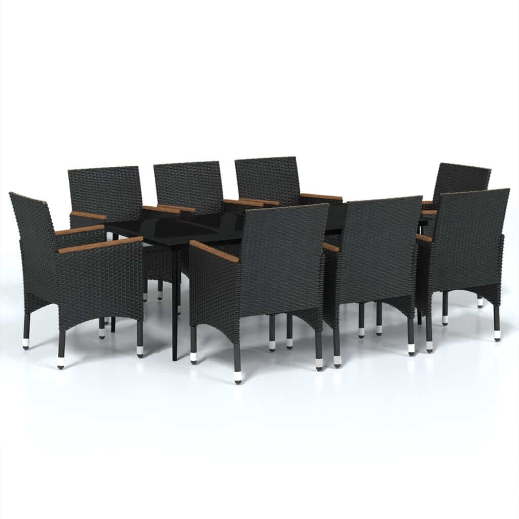 9 Piece Garden Dining Set with Cushions featuring sturdy black rattan chairs and smooth glass tabletop in outdoor setting.