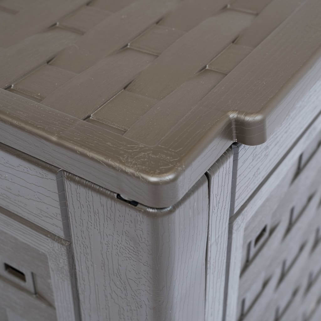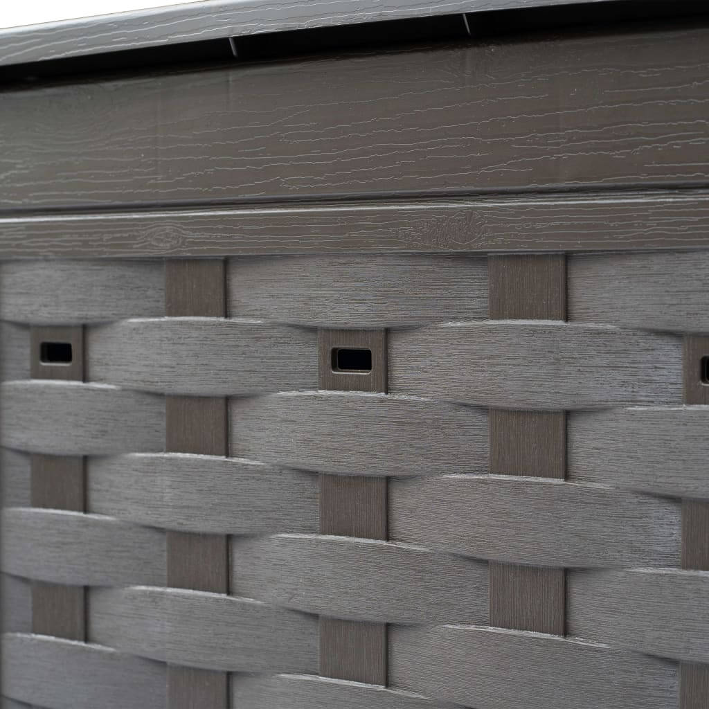 Close-up of garden composter lid featuring rattan texture and weather-resistant plastic design.