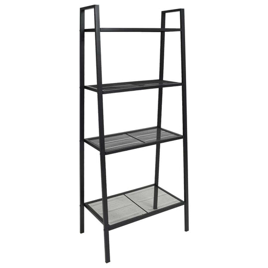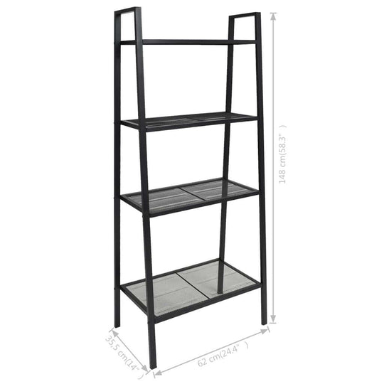 Black metal ladder bookcase with 4 mesh shelves, ideal for storage and display in limited spaces. Perfect furniture for living rooms or offices.