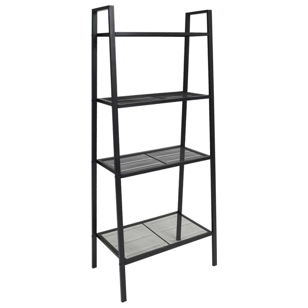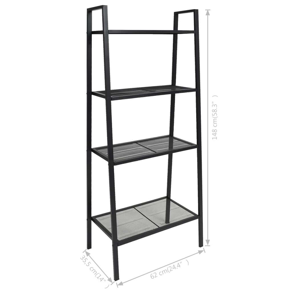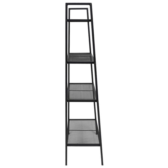 Black metal ladder bookcase with 4 mesh shelves, perfect for storage or display in limited space for furniture enthusiasts.