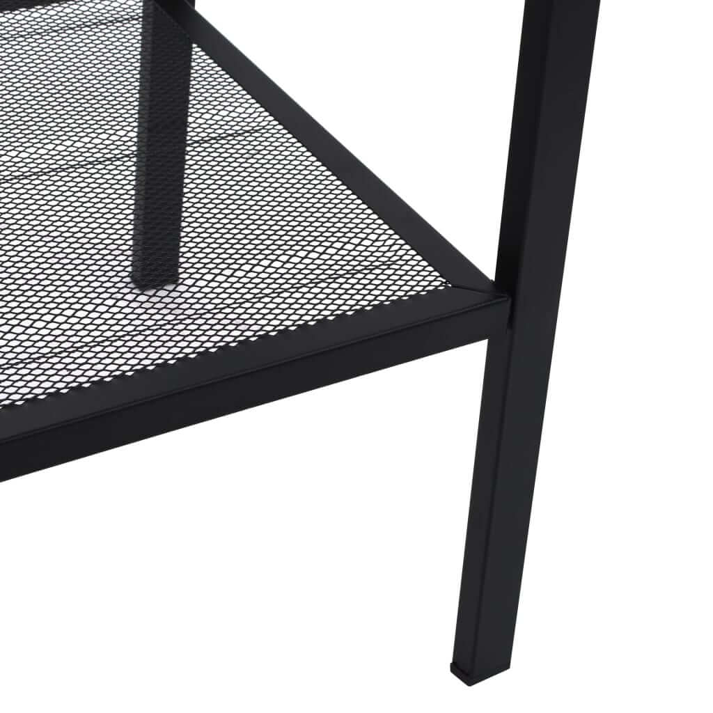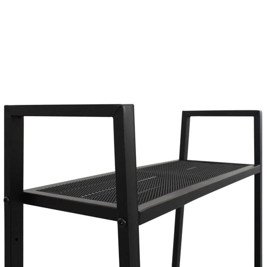 Close-up view of the mesh shelf construction on a black metal ladder bookcase, ideal for stylish storage and display.