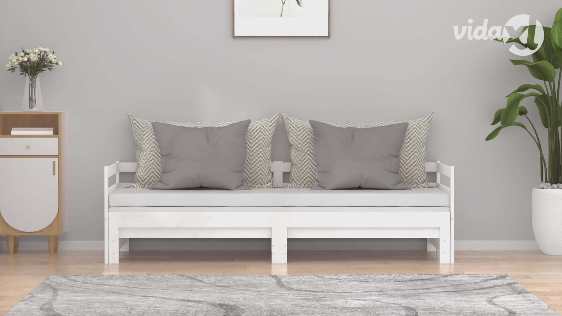 Solid pinewood pull-out day bed, perfect for indoor and outdoor patio furniture, versatile home and garden furniture solution.